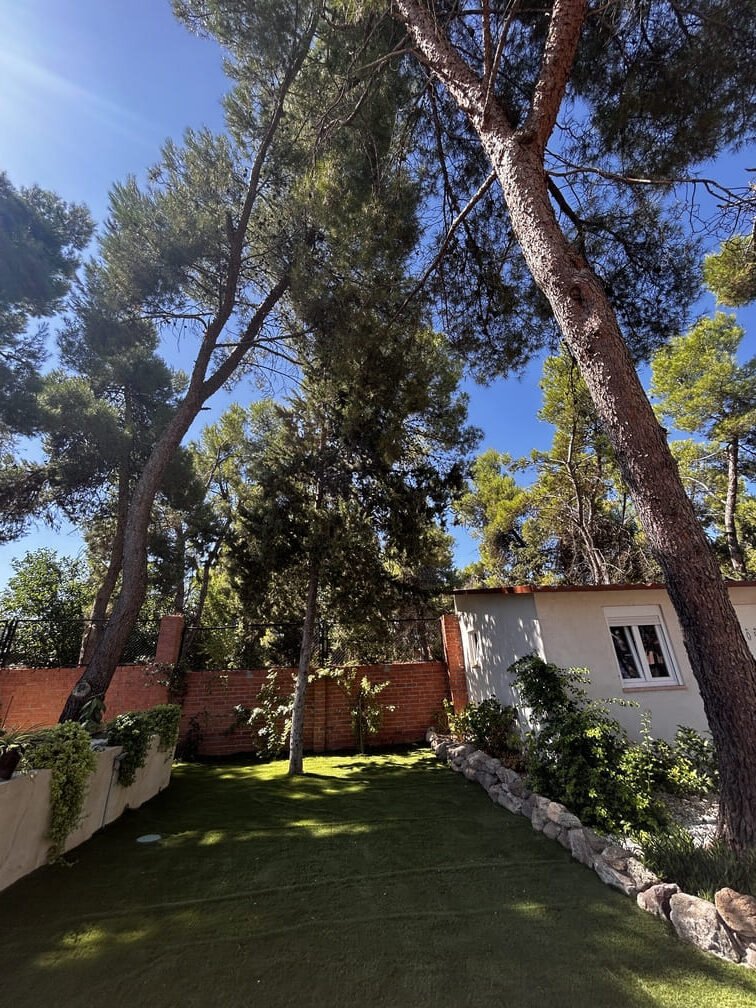 Jardín con pinos y zonas de sombra.